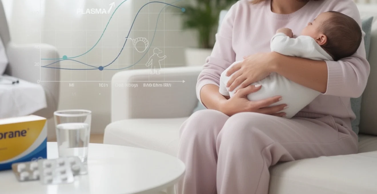 L’absorption gastro-intestinale demeure rapide avec un Tmax (temps pour atteindre la concentration maximale) compris entre 30 et 60 minutes après administration orale. Cette rapidité d’action constitue un avantage considérable pour le soulagement symptomatique des douleurs post-partum. La biodisponibilité n’est pas altérée par l’état d’allaitement, maintenant son efficacité thérapeutique habituelle.